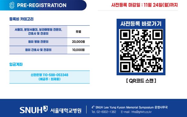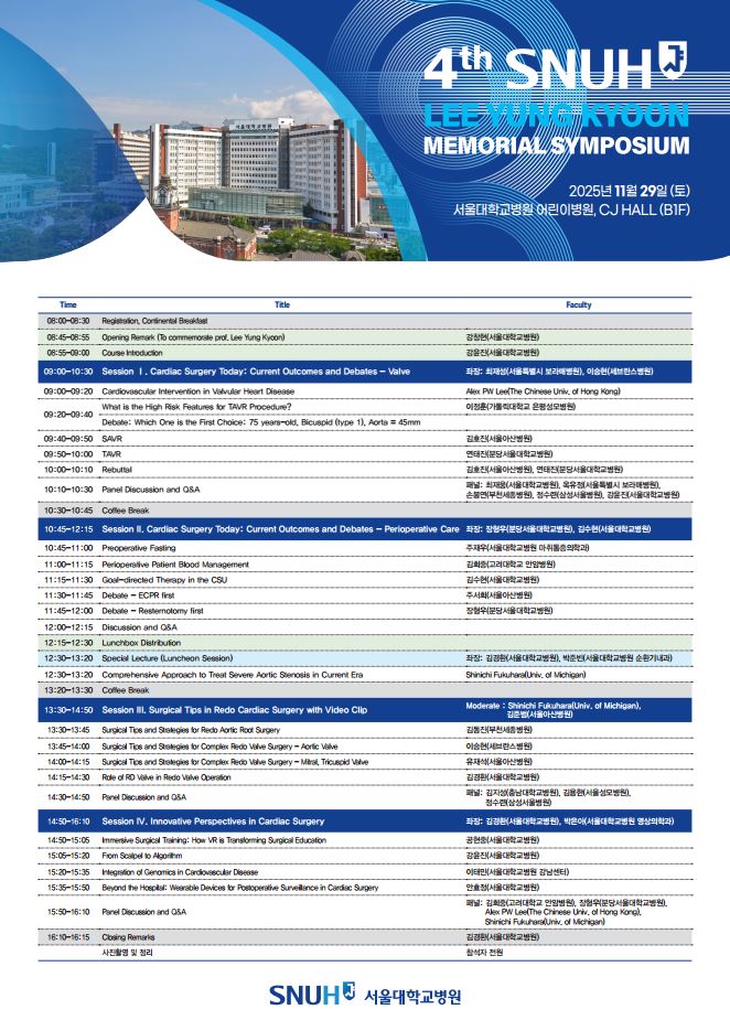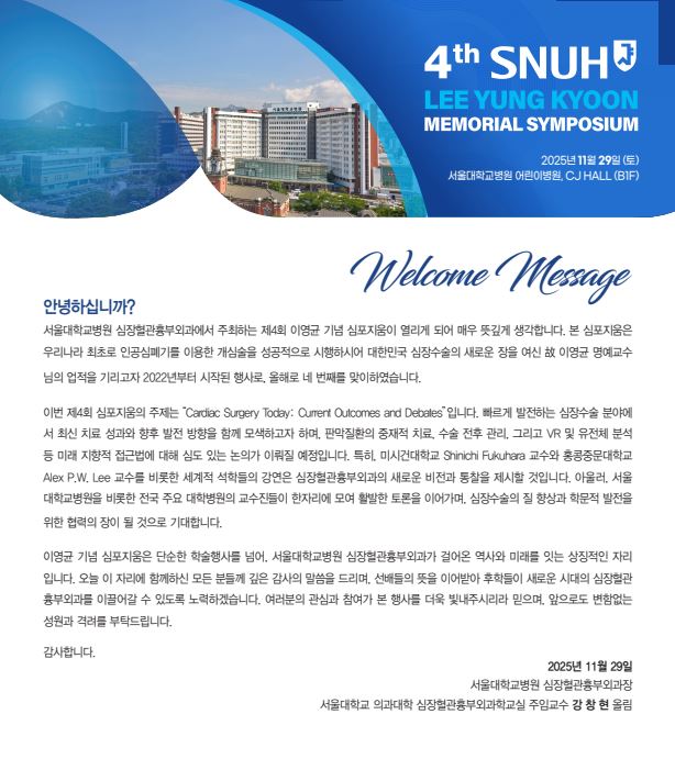 [심장혈관흉부외과] 4th SNUH LEE YUNG KYOON MEMORIAL SYMPOSIUM 일자 : 2025.11.29 (토) 장소 : 서울대학교병원 어린이병원, CJ HALL(B1F) 행사안내 인사말 행사 안내 프로그램 교육신청 확인 오시는 길 문의처 장소 주소 03080 서울 종로구 대학로 101 서울대학교병원 어린이병원, CJ HALL(B1F) 장소 서울대학교병원 어린이병원, CJ HALL(B1F) 문의처 담당자 김수민 TEL 02-2072-2348 E-mail 52391@snuh.org 목록